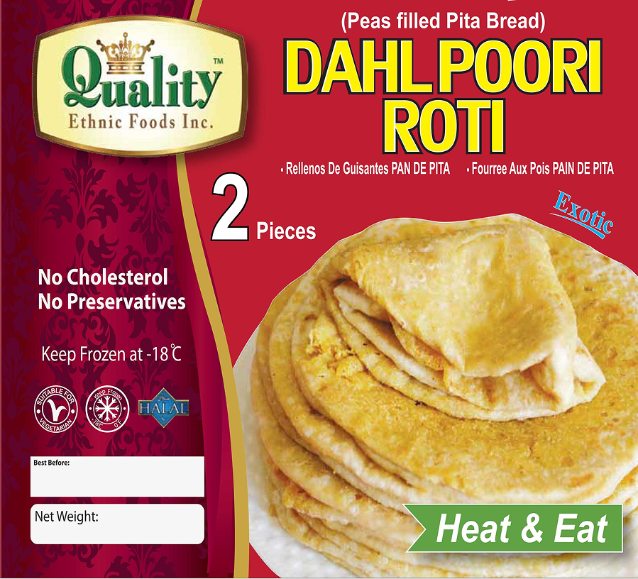 Dhal Poori Roti Nutrition Facts Serving Size ½ of 1 Piece approx Serving Per Package: 4 Amount Per Serving Calories 350 Calories from Fat 16 % Daily Value* Total Fat 2g 3.08% Saturated Fat 1g Trans 0g Cholestrol 0mg Sodium 205mg 8.5% Total Carbohydrate 58mg 19.3% Dietary Fiber 1g 15% Sugars 0g Protein 17g Vitamins A 0% Vitamins C 0% Calcium 0% Iron 0% *Parent daily values are based on 2,000 Calories diet. Your daily values are higher or lower depending on your calories needs: Calories per gram: Fat 9 Carbohydrate 4 Protien 4 Composition Farine, Sel, Levure chimique, Epoices, Pois cassés jaunes, Piment, L’huile végetale (Huille de Soja) et Eau. Instruction Keep Frozen at -18 °C. Do not freeze after thawing