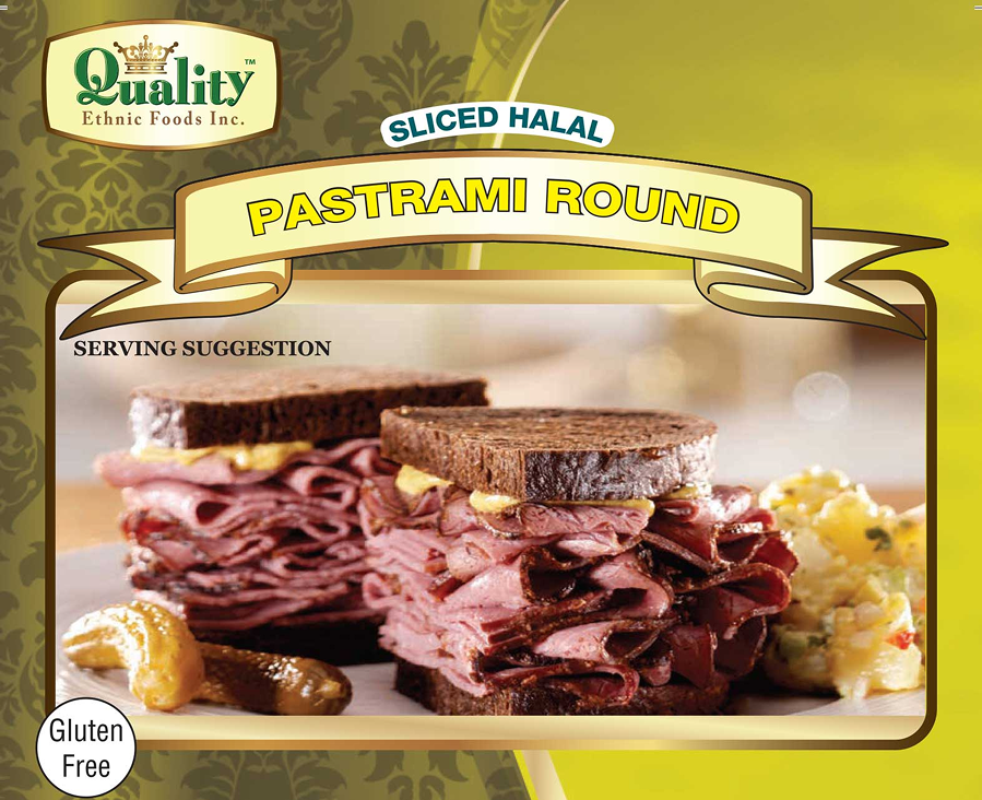 Pastrami Round Nutrition Facts Serving size 3oz (84g) Servings Per Container 4 Amount Per Serving Calories 100 Fat Cal. 35 % Daily Value* Total Fat 0g 4% Saturated Fat 0g 7% Trans 0g Cholestrol 35mg 11% Sodium 1080mg 44% Total Carbohydrate 0g 0% Dietary Fiber 0g 0% Total Sugars 0g Includes 0g Added Sugars 0% Protein 20g Vitamins A 0mcg 0% Calcium 0mg 0% Iron 0mg 0% Potassium 0mg 0% *Percent Daily Values are based on 2,000 calorie diet. Calories per gram: Fat 9 Carbohydrate 4 Protien 4 Ingredients halal beef, Water, Salt, Sodium Tripolyphosphate, Sodium Erythorbate, Garlic, Sodium Nitrite and Smoke Flavoring. Coated with Spices, Caramel Color, Brown Sugar, Garlic Powder and Mustard. Hickory Smoked Flavor Added. Caramel Color Added.