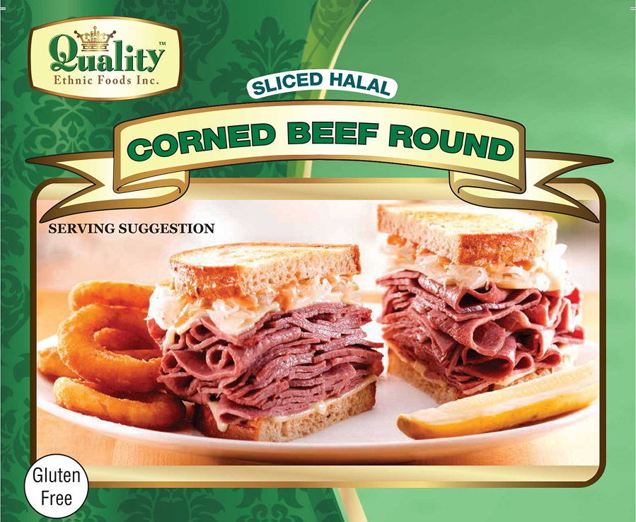 Corned Beef Round Nutrition Facts Serving size 3oz (84g) Servings Per Container 4 Amount Per Serving Calories 100 Fat Cal. 35 % Daily Value* Total Fat 0g 4% Saturated Fat 0g 7% Trans 0g Cholestrol 35mg 11% Sodium 1080mg 44% Total Carbohydrate 0g 0% Dietary Fiber 0g 0% Total Sugars 0g Includes 0g Added Sugars 0% Protein 20g Vitamins A 0mcg 0% Calcium 0mg 0% Iron 0mg 0% Potassium 0mg 0% *Percent Daily Values are based on 2,000 calorie diet. Calories per gram: Fat 9 Carbohydrate 4 Protien 4 Ingredients halal beef, Water, Salt, Sodium Tripolyphosphate, Sodium Erythorbate, Garlic and Sodium Nitrite.
