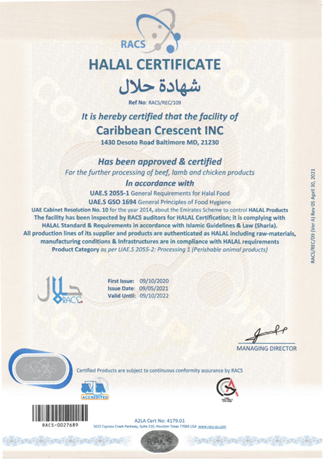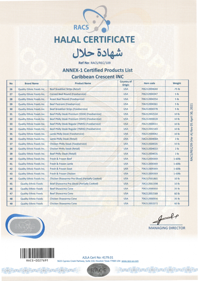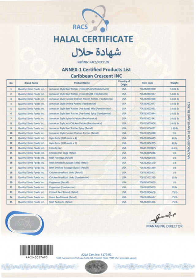 Quality Ethnic Foods Inc. manufacturing procedures have been investigated and assessed by RACS Halal, a well-respected Halal certifying body, for Hand-Cut Halal Certification, and found to be in compliance with the Islamic Dietary Laws.